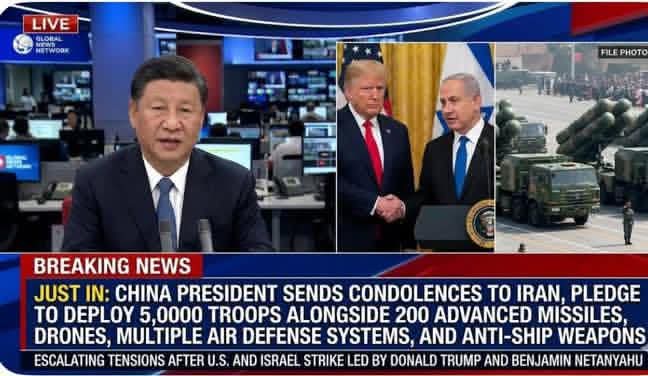 REPORT: China President Xi Jinping Send Condolences to Iran, Pledge to Deploy 5,000 Troops to Iran Alongside 200 Advanced Missiles, Drones, Multiple Air Defense Systems, and Anti‑Ship Weapons, Escalating Tensions After U.S. and Israel Strike Led by Donald Trump and Benjamin Netanyahu